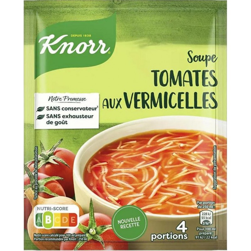 Découvrez la soupe déshydratée Tomates aux Vermicelles Knorr ®. Ce potage est concocté sans conservateur et sans exhausteur de goût. La déshydratation est l'une des plus anciennes méthodes de préservation des aliments. Elle consiste simplement à retirer l'eau des ingrédients afin de conserver leur qualité et leur saveur. Dans la même gamme des soupes déshydratées Knorr®, découvrez aussi la Soupe Poule aux Vermicelles et la Soupe Crème de Brocoli. Ce format vous permet de réaliser quatre généreux bols de soupe. Une recette de soupe savoureuse et réconfortante prête en cinq minutes: faites bouillir 1L d'eau, ramenez à feu doux, puis versez le contenu du sachet en remuant avec un fouet. Laissez mijoter 5 minutes en remuant régulièrement. Inutile de saler. C'est prêt! Il ne vous reste plus qu'à déguster. De plus, l'emballage de cette soupe est majoritairement recyclable. Knorr® œuvre pour un futur alimentaire durable avec ses agriculteurs partenaires. Chez Knorr®, une utilisation responsable des ressources agricoles contribue à vous offrir des soupes de qualité. C'est pourquoi nous faisons le choix de légumes issus de l'agriculture durable et cultivés en plein champ pour vous préparer nos délicieuses soupes. Grâce à nos produits, recettes et conseils, nous souhaitons vous aider à faire des petits changements quotidiens qui font toute la différence. vermicelle: 43% (semoule de BLE dur, farine de BLE), tomate: 22%, amidon de pomme de terre, sel, sucre, oignon: 2,5%, extrait de levure, huile de maïs, CELERI-RAVE, arômes, épice et aromates (ail, basilic, persil tubéreux, poivre), jus de citron (maltodextrine, jus de citron). Peut contenir: AVOINE, GRAINES DE SESAME, LAIT, MOUTARDE, OEUF, ORGE, SEIGLE, SOJA. issus de l'agriculture durable: 25%. Produit unitaire EAN 8720182933065.